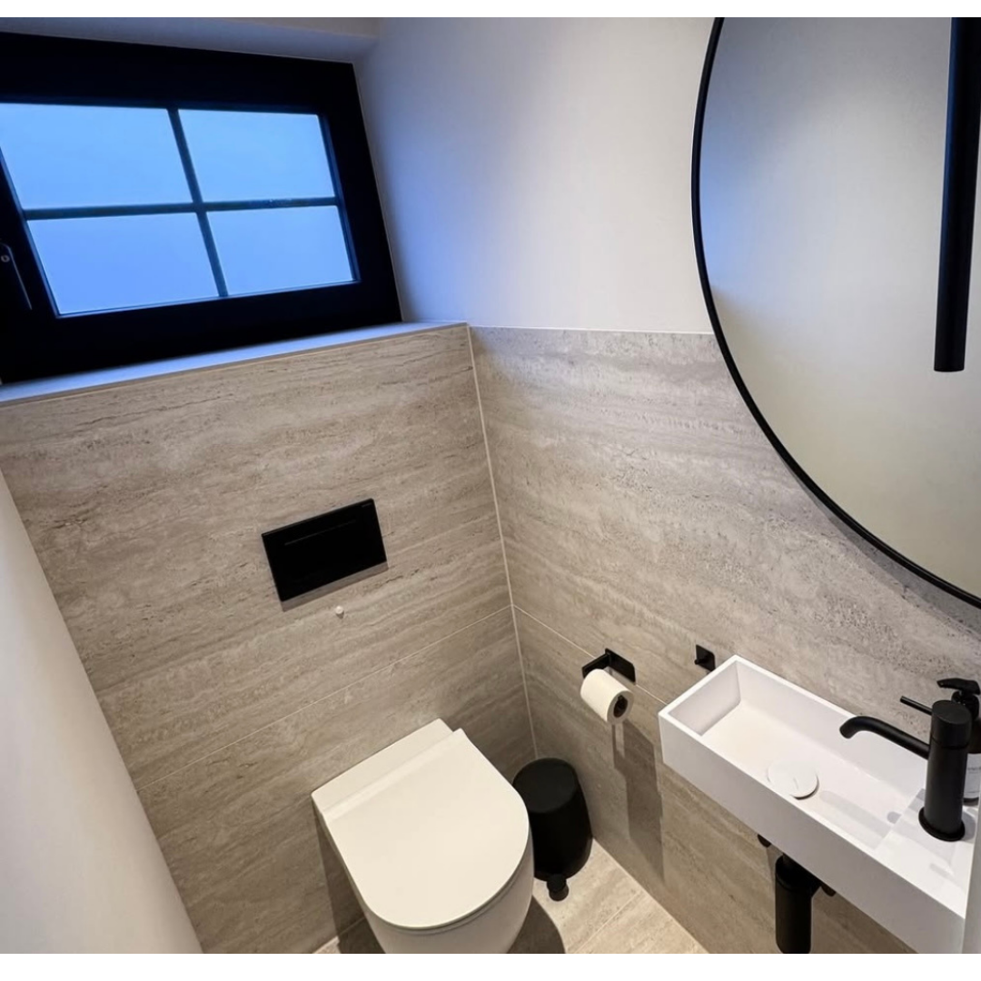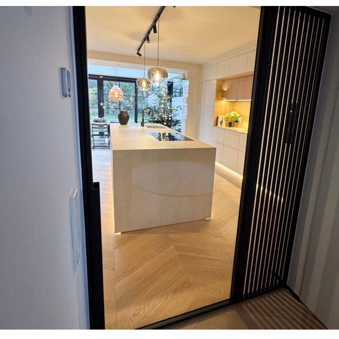 De basis van de woning werd gelegd met een elegante Hongaarse punt vloer, die direct een exclusieve en warme uitstraling creëert. De open keuken is niet alleen een eyecatcher, maar ook een perfect samenspel van strak design en functionaliteit. In de woonkamer is aan elk detail gedacht, met een afwerking die stijl en comfort moeiteloos combineert.De dunpleister gestuukte en gesauste muren in Sandy Beach zorgen voor een serene en moderne uitstraling, terwijl een sfeervolle haard extra warmte en gezelligheid toevoegt. Zwarte stalen deuren geven het geheel een eigentijdse en karaktervolle touch.Dit is geen standaard renovatie, maar een complete transformatie naar wonen in ultiem comfort.