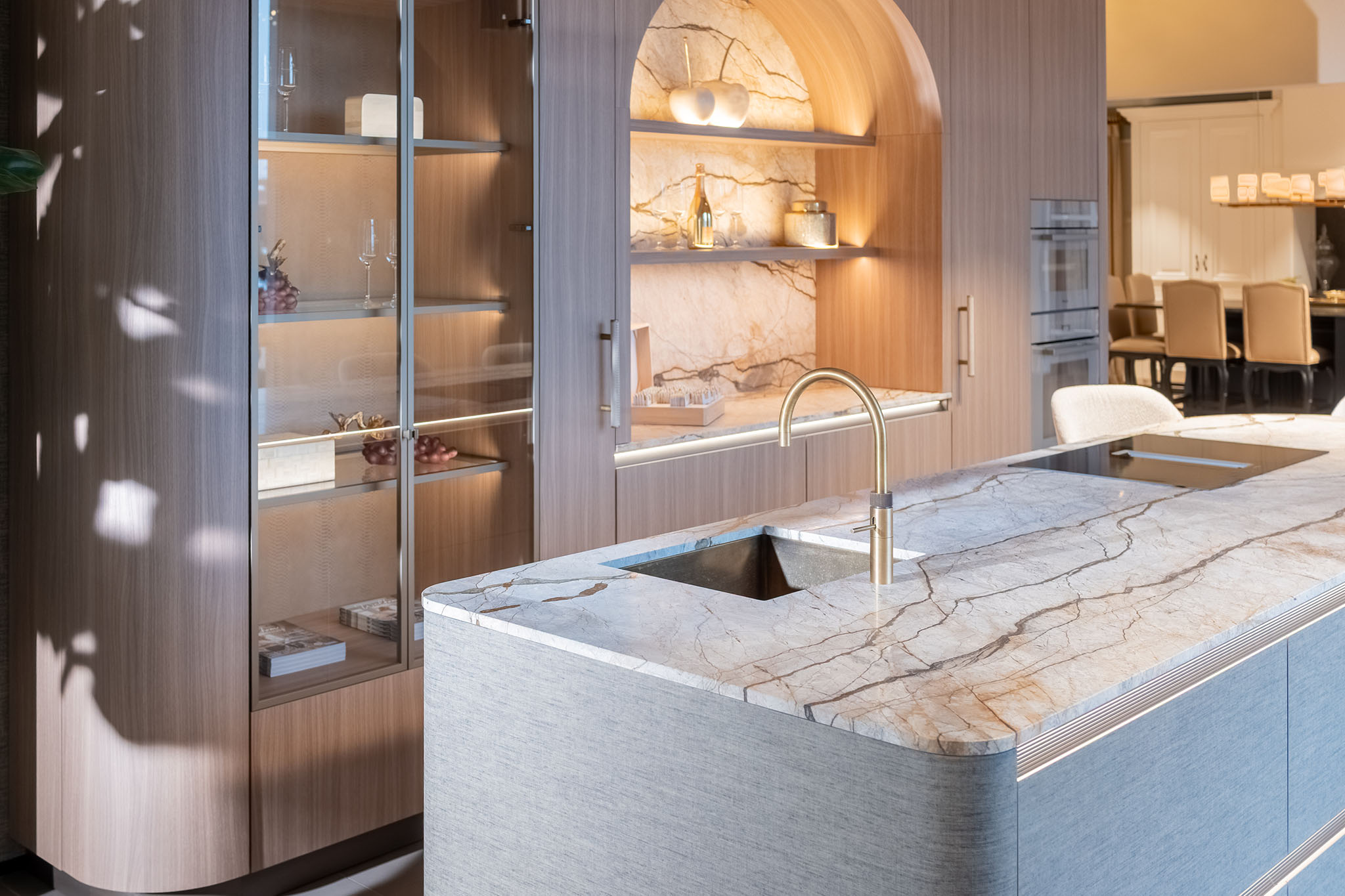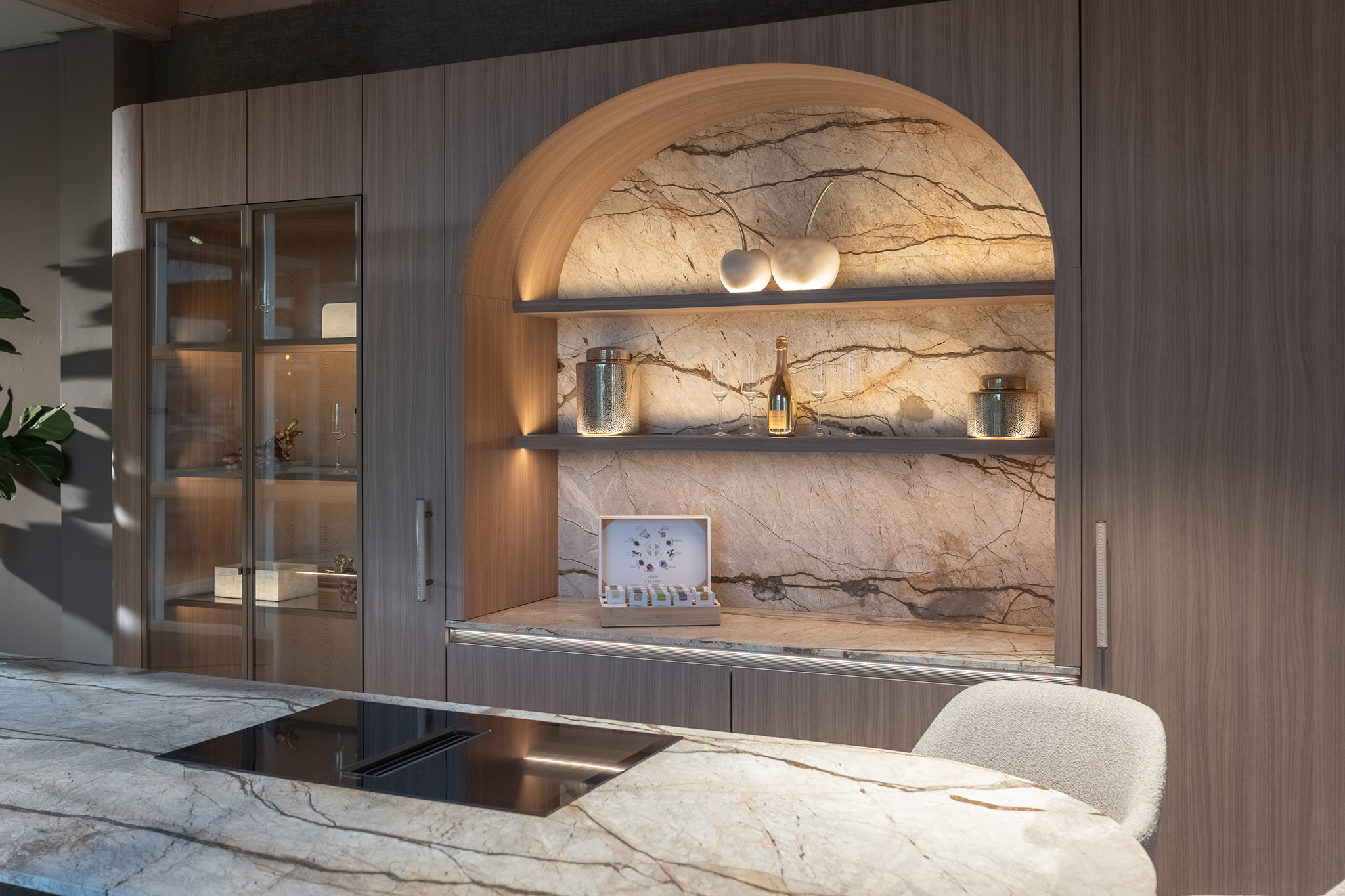 De hoge kastenwand van Mereno vormt het stijlvolle hart van deze opstelling. De fronten zijn uitgevoerd in Poro Noce (LS96) van DecoLegno: een lichte houtkleur met voelbare structuur. De afwerking is uniek: de afgeronde hoeken geven de kastwand een bijzonder karakter. De koffienis is verlicht en bekleed met gepolijst marmer (Silver Roots van Arte). Ook hierin zorgt de ronde vormen voor een aansluitend geheel.