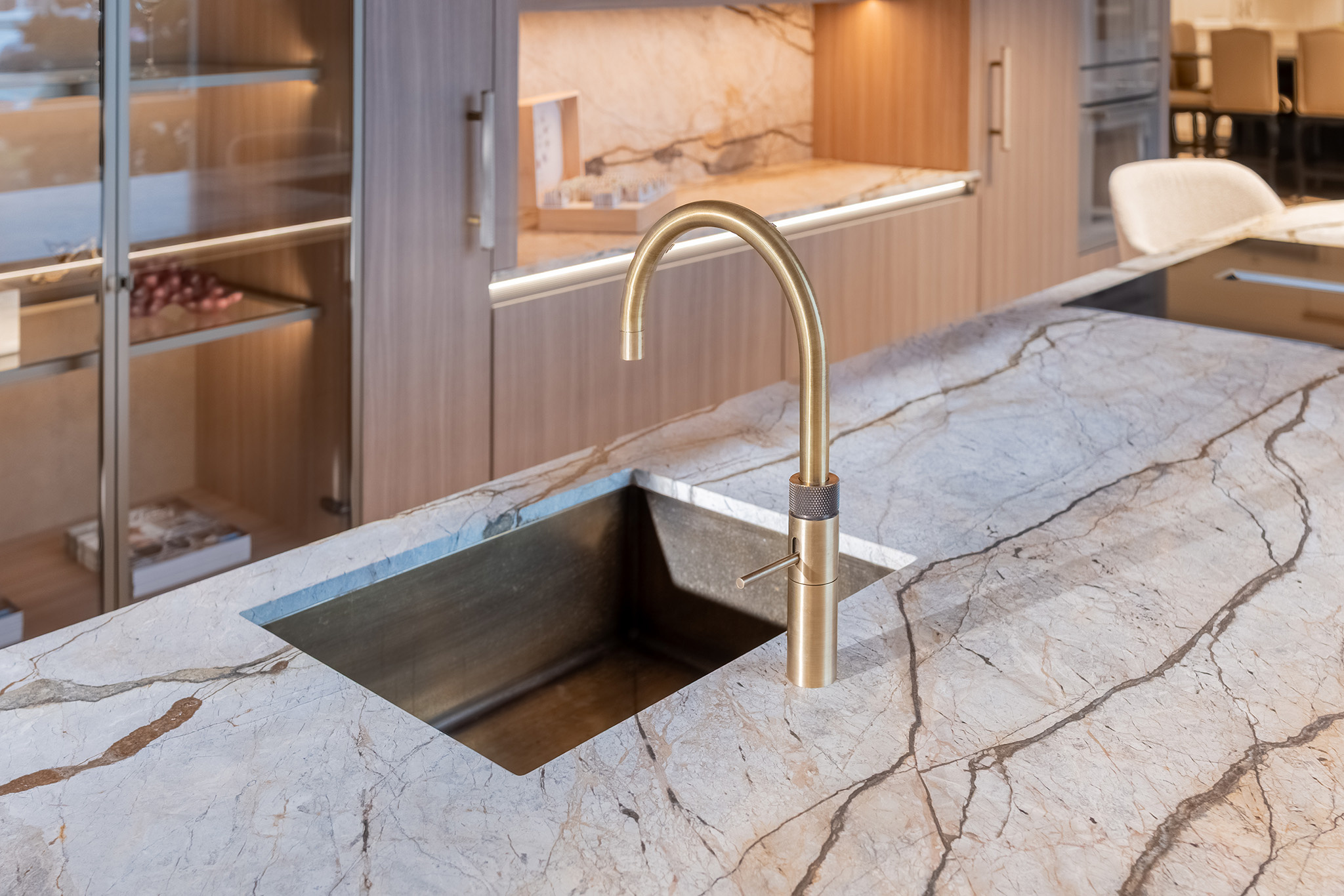 Het werkblad is uitgevoerd in gepolijst marmer van Arte, in de kleur Silver Roots. De combinatie met de Quooker Combi+ Fusion Round en de Doeco Frenkie spoelbak, beide in Messing Patina, maakt het plaatje compleet. Deze afwerkingen zorgen voor een rijke, warme uitstraling die perfect past bij het kleurpalet van de keuken.