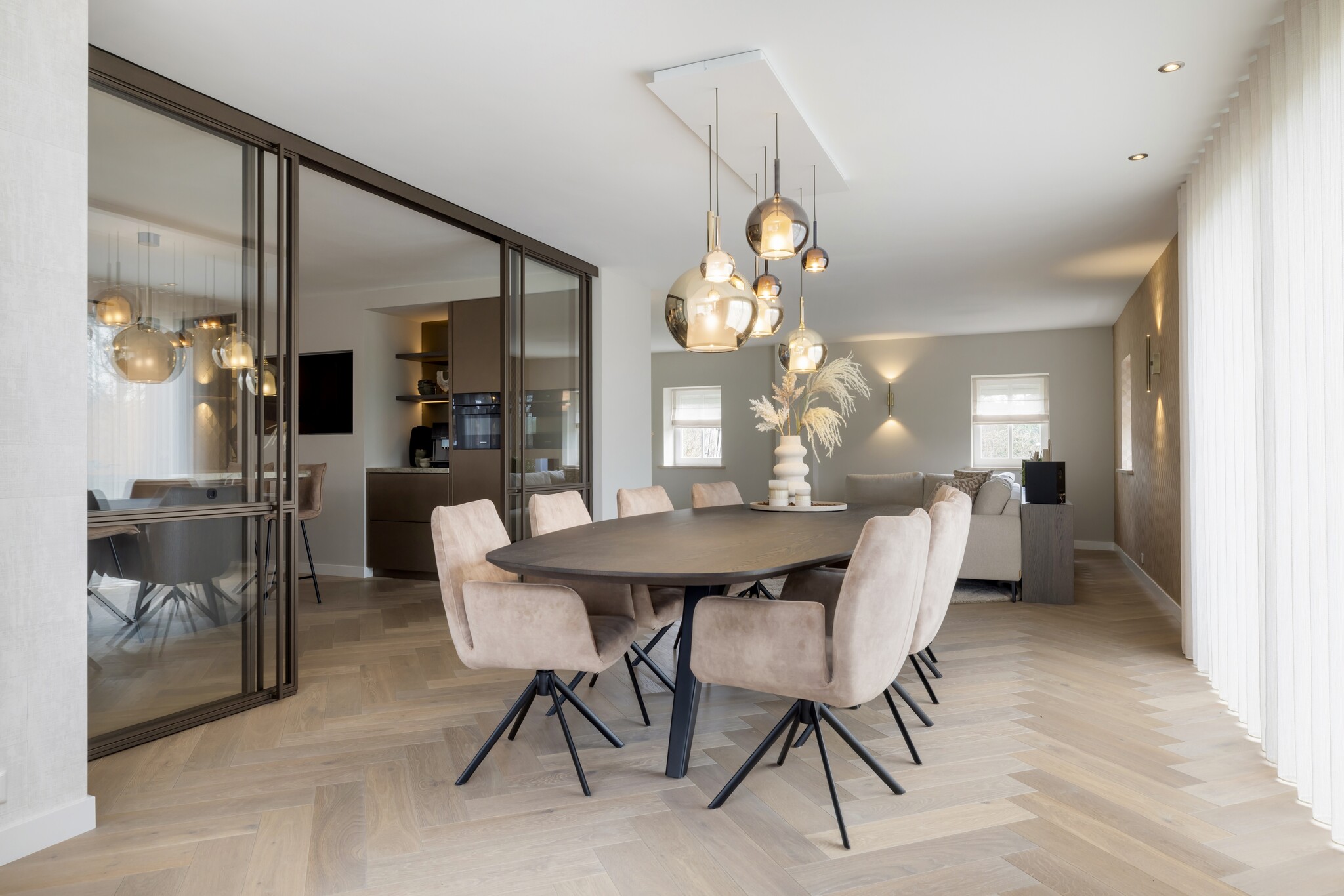 In de woon- en eetkamer is gekozen voor een multiplank visgraatvloer in eiken, die rust en ritme geeft aan de ruimte. De grote glazen schuifdeuren zorgen voor optimale lichtinval en verbinden de verschillende leefruimtes met elkaar. De ovale eettafel met fluweelzachte stoelen vormt het hart van de ruimte, verlicht door een opvallende compositie van gouden designlampen. Op de achtergrond zien we maatwerkkasten met sfeervolle nisverlichting. Perfect afgestemd op het luxueuze natuurlijke behang en het zachte spuitwerk in bronstint.