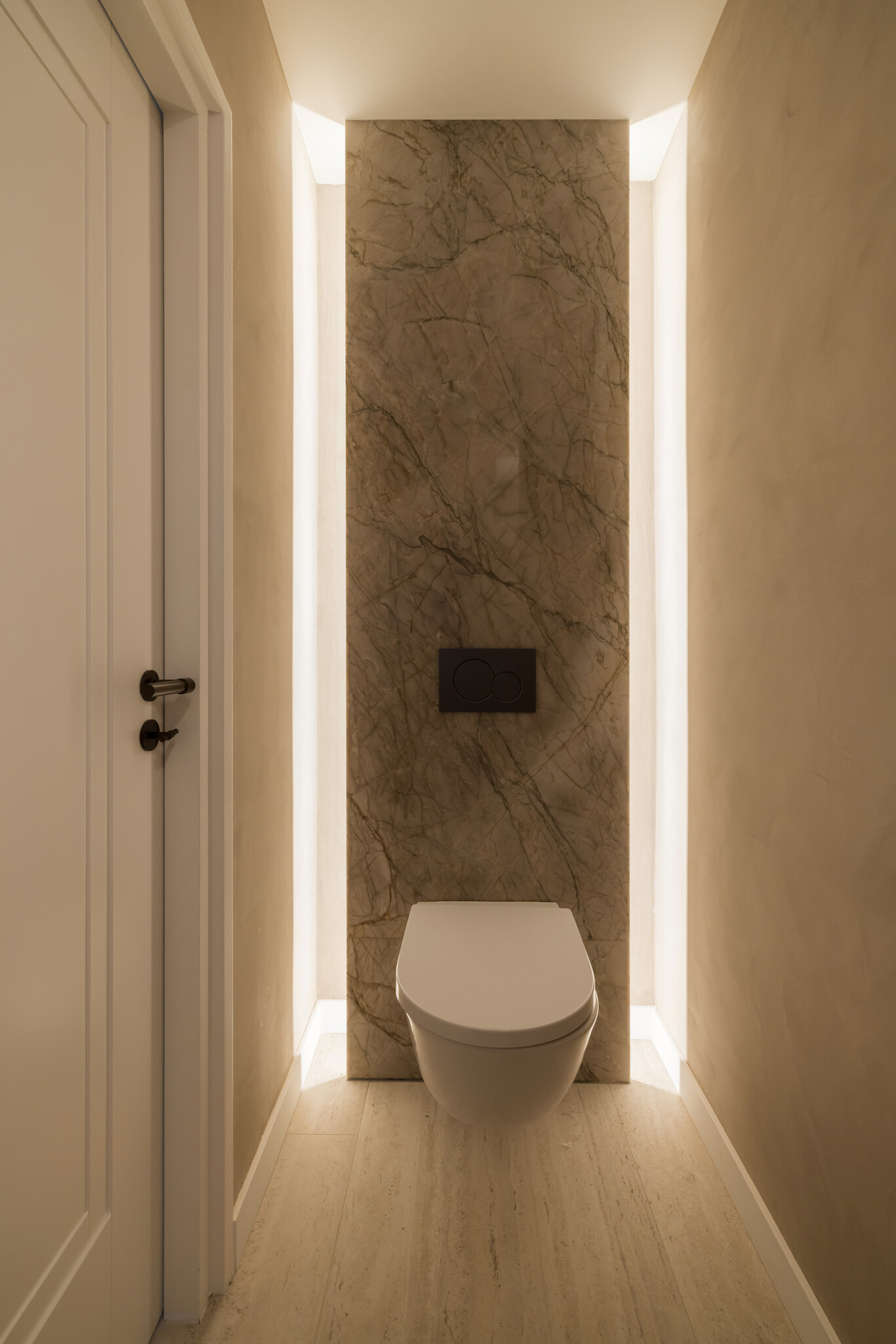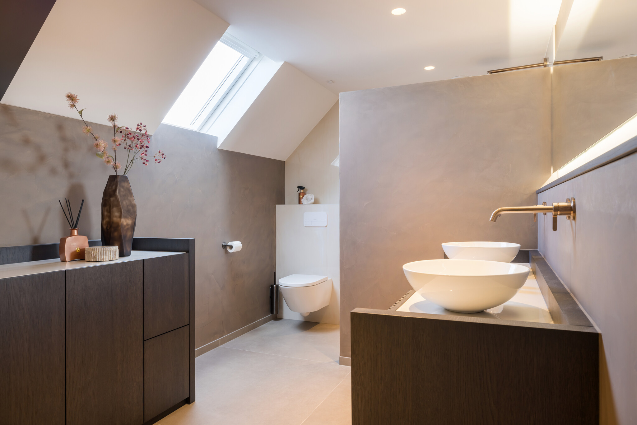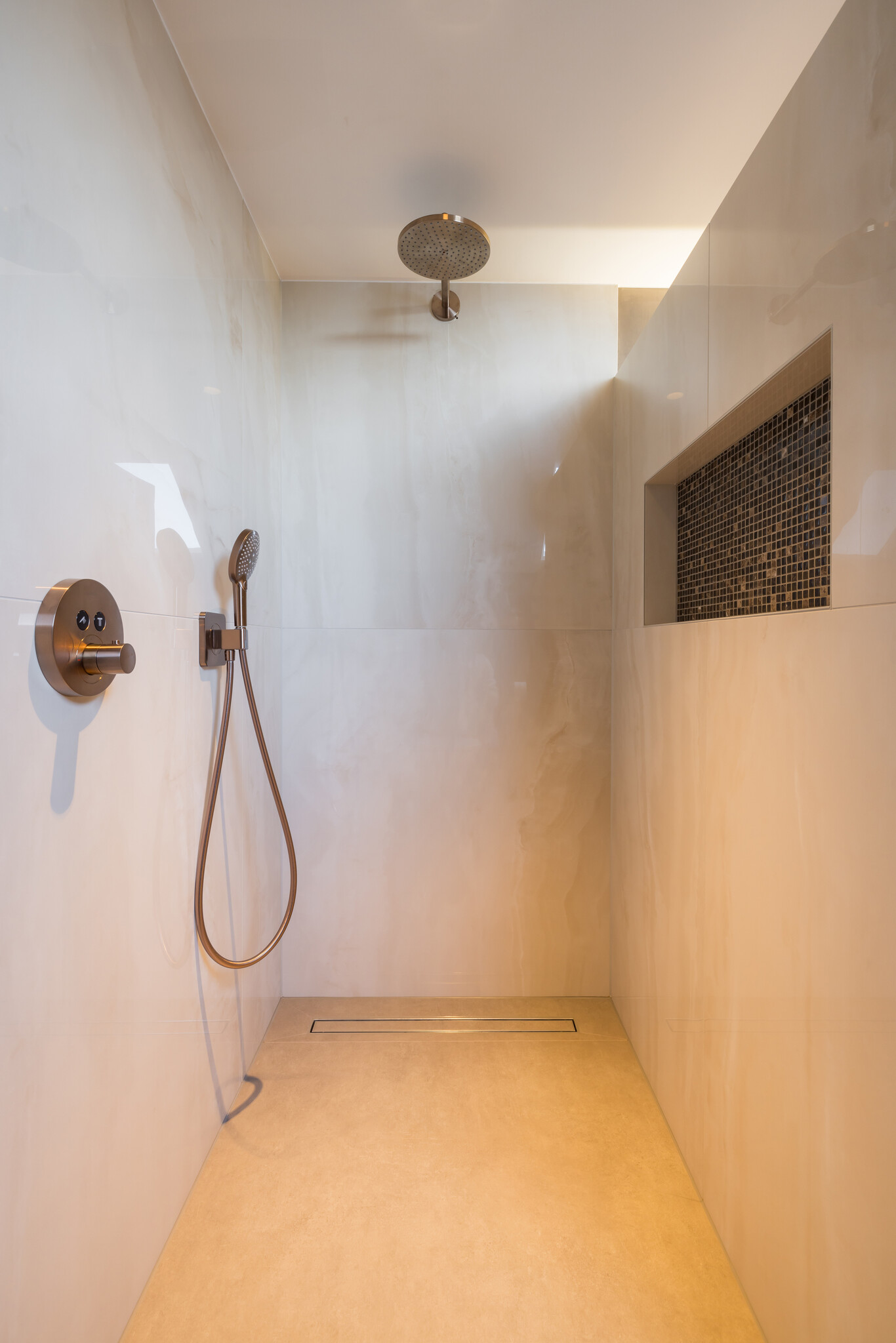 Ook in de badkamer is gekozen voor een uitgebalanceerd kleurenpalet en verfijnde materialen. De inloopdouche met grootformaat wandpanelen oogt strak, warm en minimalistisch. In het toilet valt vooral het maatwerkmeubel met afgeronde hoeken op, bekleed met natuursteen en voorzien van zwarte designkranen. Kleine details maken hier het verschil: indirect licht, zachte materialen en gebogen vormen versterken het luxe gevoel.