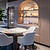 De open leefkeuken combineert comfort met een verfijnde uitstraling. Het aanrechtblad van Terra Nova, een levendig natuursteen met warme adering, vormt samen met het afgeronde keukeneiland een elegant geheel. De fronten zijn uitgevoerd in een matte bronsfinish en sluiten perfect aan bij de moderne inbouwapparatuur en minimalistische verlichting. Hier staat functionaliteit volledig in dienst van esthetiek.
