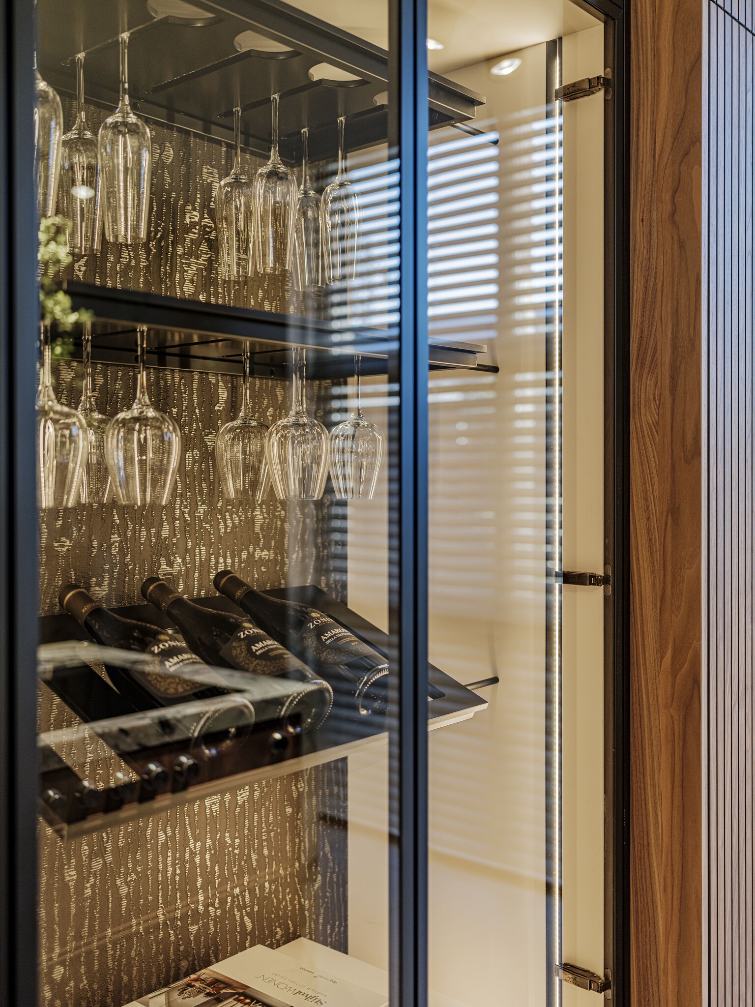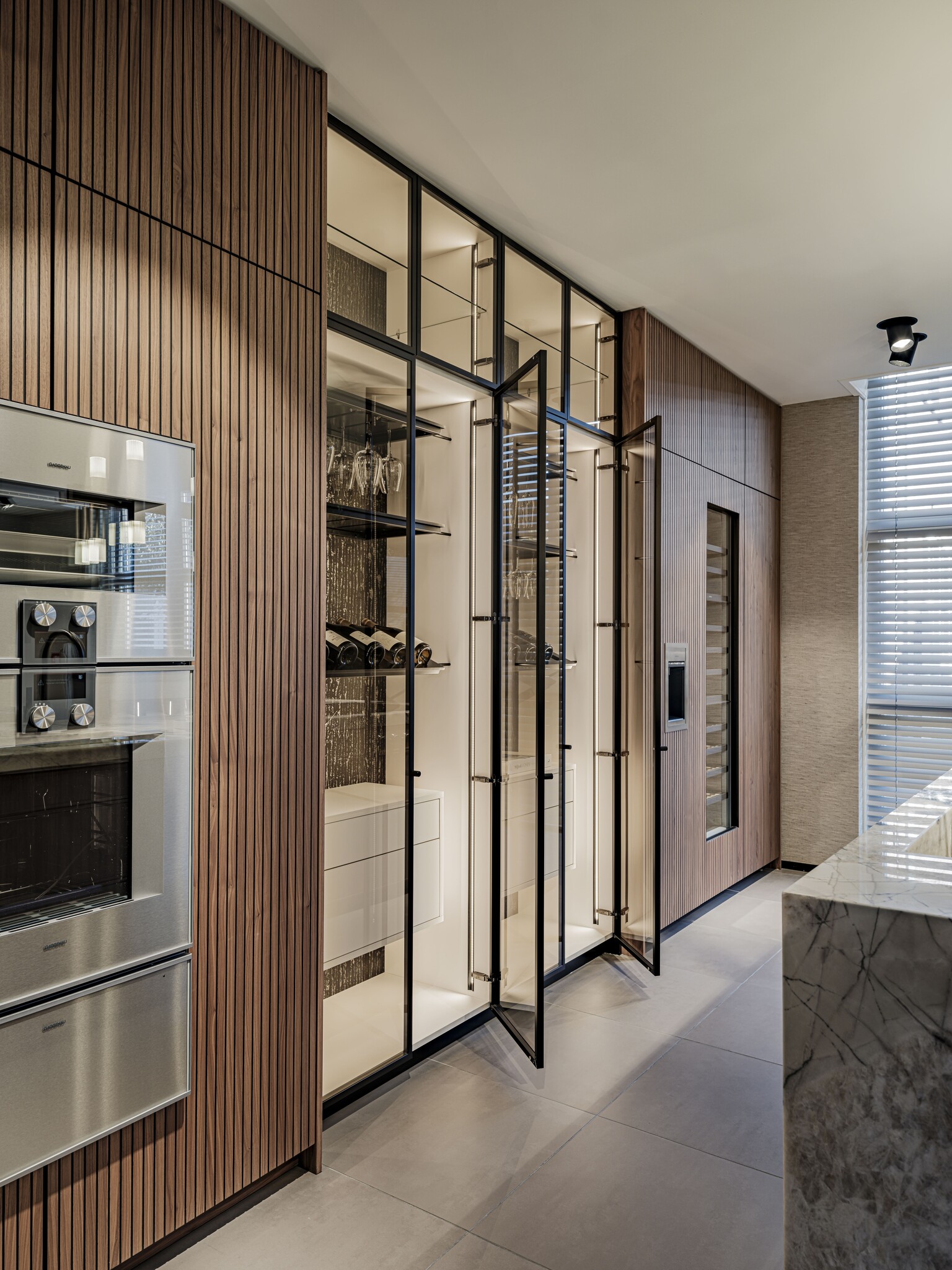 Deze exclusieve Mereno keuken heeft hoge kastenwanden en glaskasten met wijnglazenrekken en wijnplateaus. Kastenwanden in lamellenstructuur worden steeds vaker gebruikt in de keuken en geven een speels stijlvol effect. De donkere houttinten met metalen accenten geven sfeer aan de keuken.