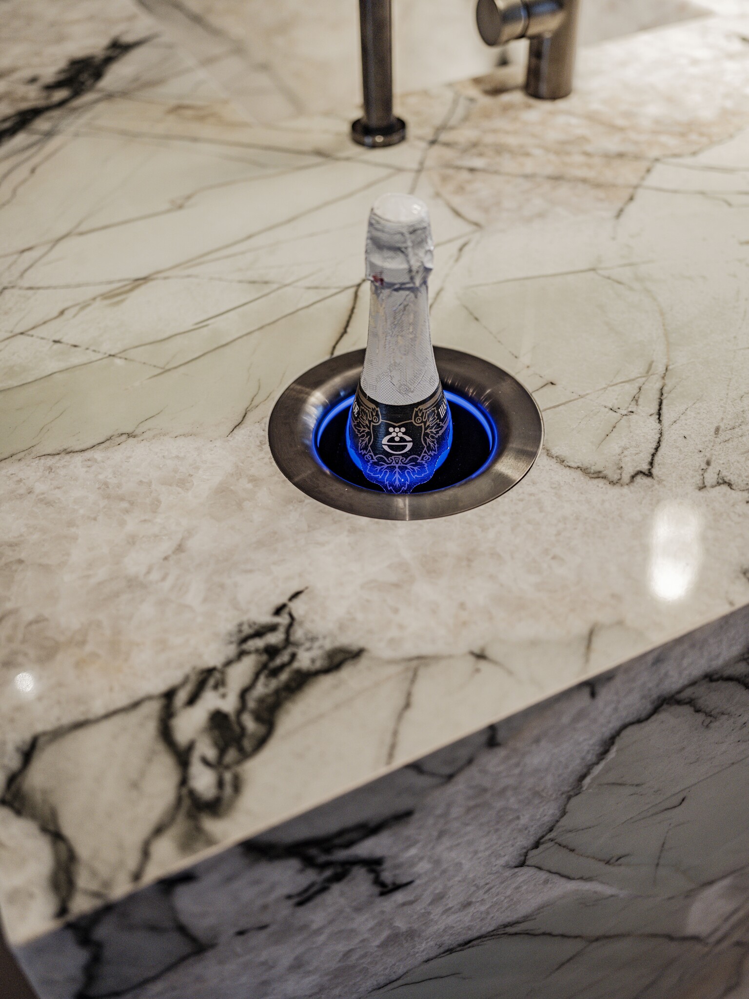 Het keukenblad van het kookeiland is een Grillo natuurstenen blad in marmerlook. Het eiland is voor het grootste gedeelte uitgevoerd in hetzelfde materiaal, zo ook de spoelbak. Een leuk detail is de verlichte nis aan de voorzijde van het eiland. De achterzijde van het kookeiland heeft gebeitste kader fronten in noten fineer.