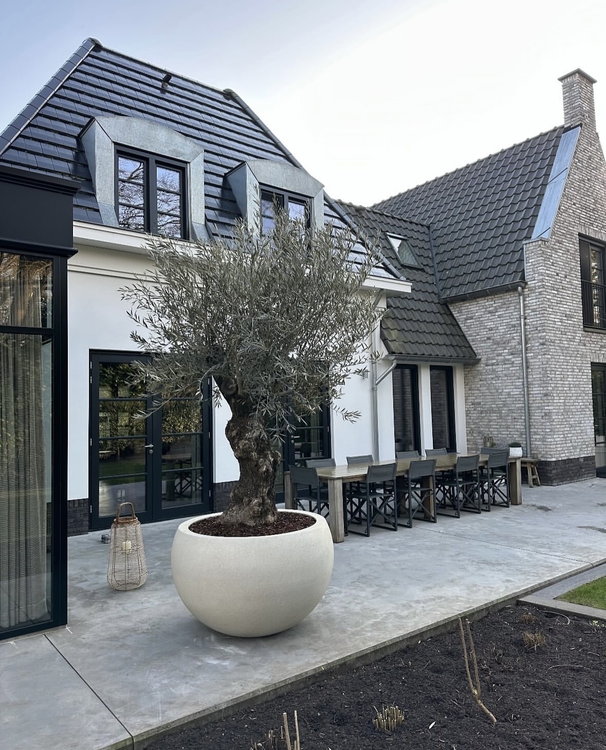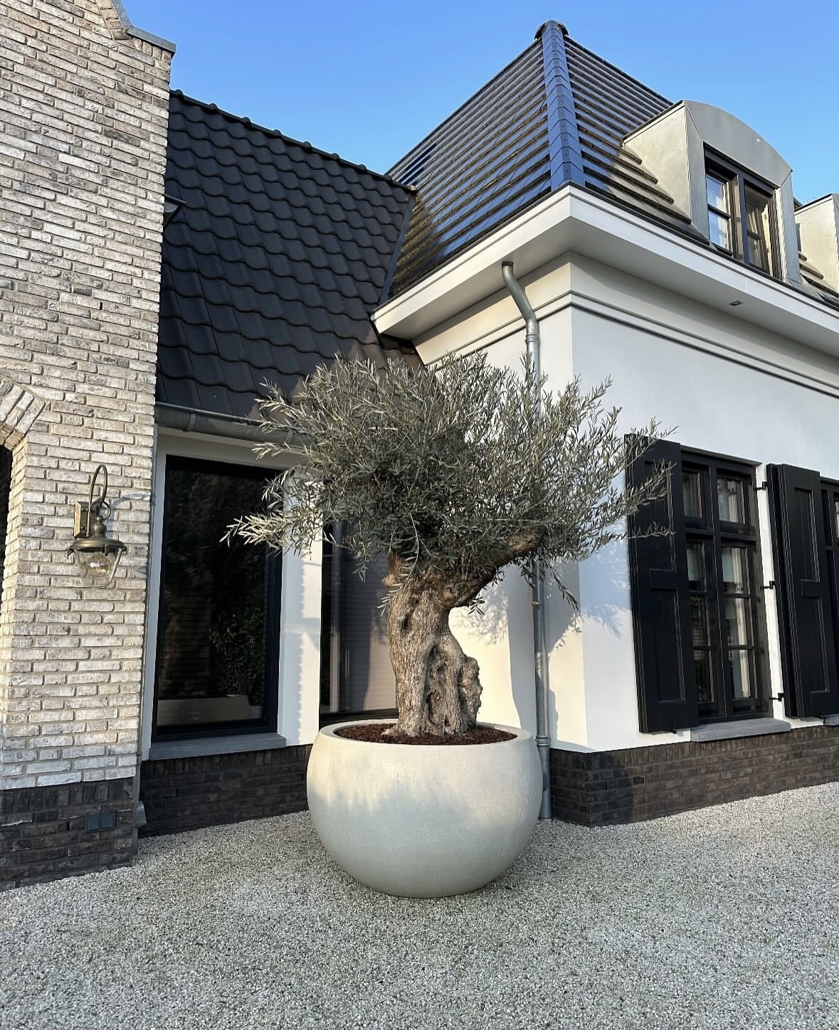 Een karaktervolle entree met robuuste olijfbomen – alsof je in Toscane binnenkomt. Deze bomen brengen niet alleen sfeer, maar functioneren ook als natuurlijke sculpturen. De grillige stammen, het zilvergroene blad, de robuuste uitstraling – dit zijn levende kunstwerken.