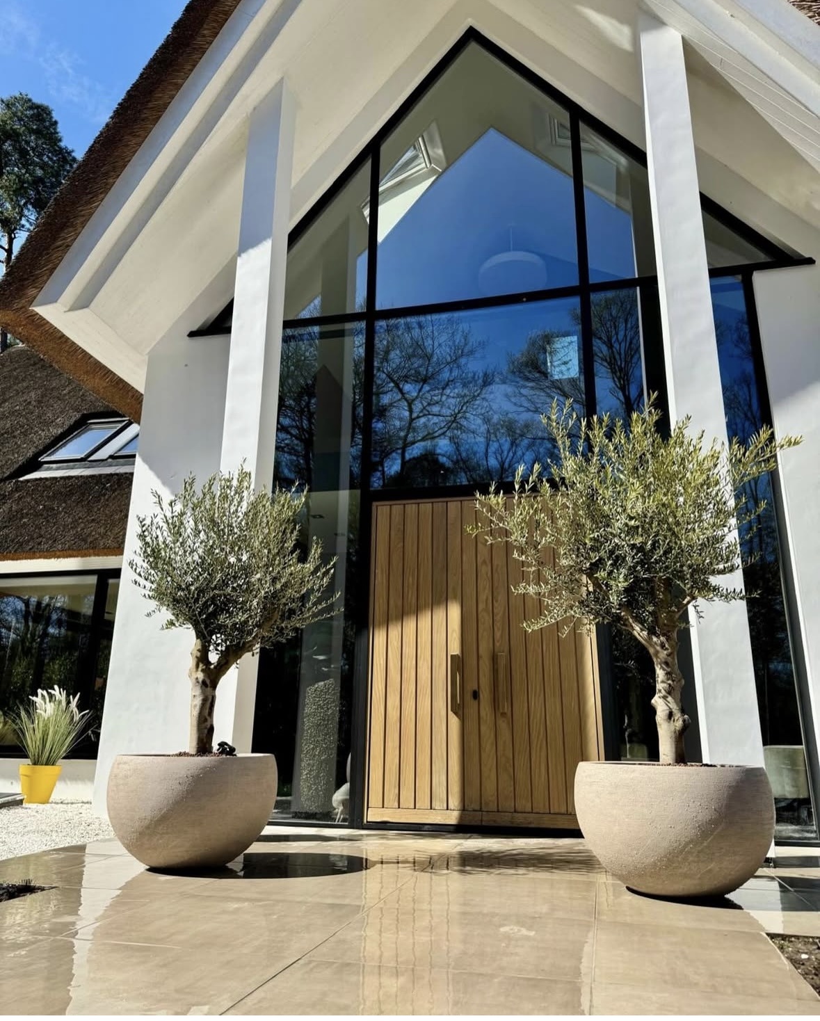 Deze olijfbomen versterken de moderne, cleane look van de woning en voegen een warme, tropische sfeer toe.