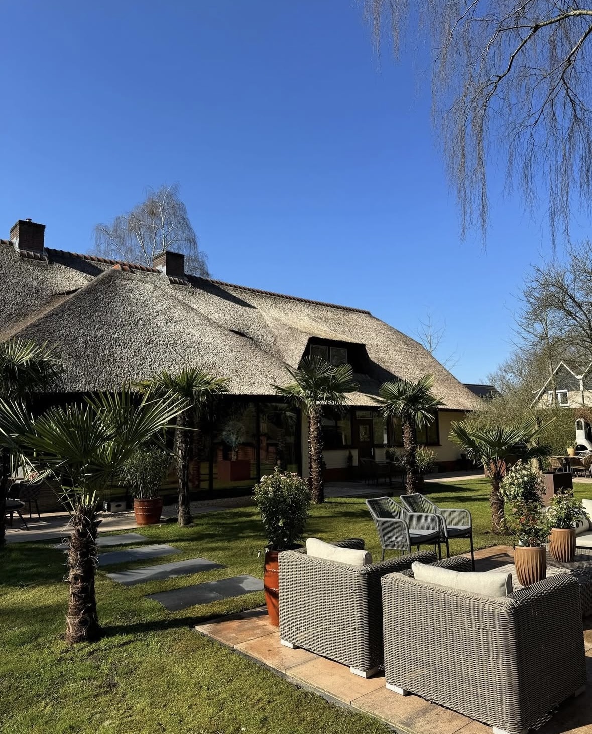 Een luxe zithoek in eigen tuin, omringd door palmen – alsof je op vakantie bent, maar dan thuis.