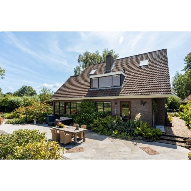 De woning beschikt over een ruime entreehal met toegang tot het toilet, een garderobe, meterkast en trapopgang. Vanuit de hal komt u in de royale woonkamer met een aparte zithoek. Grote raampartijen zorgen voor veel daglicht en een houtkachel geeft de ruimte extra sfeer. De stenen vloer is robuust en praktisch. Via de schuifpui bereikt u de diepe achtertuin, die op het zuidwesten is gericht.