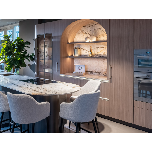 De hoge kastenwand van Mereno vormt het stijlvolle hart van deze opstelling. De fronten zijn uitgevoerd in Poro Noce (LS96) van DecoLegno: een lichte houtkleur met voelbare structuur. De afwerking is uniek: de afgeronde hoeken geven de kastwand een bijzonder karakter. De koffienis is verlicht en bekleed met gepolijst marmer (Silver Roots van Arte). Ook hierin zorgt de ronde vormen voor een aansluitend geheel.